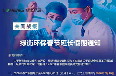 尊敬的客戶:新型肺炎防疫形勢(shì)嚴(yán)峻,結(jié)合國家防控要求,綠衡環(huán)保經(jīng)研究決定春節(jié)假期延至2月9日,2月10日正式開工。全心全意為您服務(wù),共渡難關(guān)再創(chuàng)輝煌。