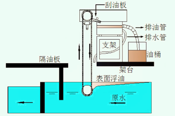 油分離回收過(guò)程:一體化油水分離回收裝置是利用油水之間不同的重力和表面張力這些物理特性,使刮油帶在穿過(guò)水面時(shí)吸取浮油、重油等有機(jī)液體。當(dāng)攜油帶繞過(guò)重輪向上離開液面時(shí),液面上的油吸附在濾帶的表面進(jìn)入二次分離池,經(jīng)二次分離后進(jìn)入收集器。一體化油水分離回收裝置采用進(jìn)口的立毛纖維濾帶。立毛纖維濾帶是在粗目的NYLON織布上涂敷特殊粘合劑后,利用靜電植毛技術(shù)于其上種植長(zhǎng)度不等且具方向性的NYLON纖維而成。