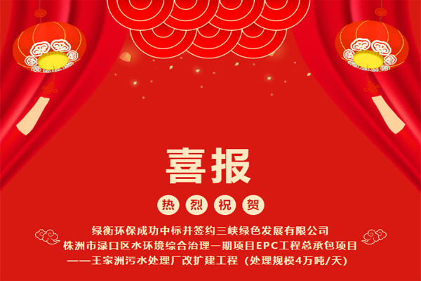 喜報熱烈祝賀綠衡環(huán)保成功中標(biāo)并簽約三峽綠色發(fā)展有限公司株洲市淥口區(qū)水環(huán)境綜合治理一期項目EPC工程總承包項目——王家洲污水處理廠改擴(kuò)建工程(處理規(guī)模4萬噸/天)...